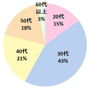 30代が最も多く、次いで40〜50代の利用者が中心です。幅広い年代の方が通いやすいスタジオといえます。