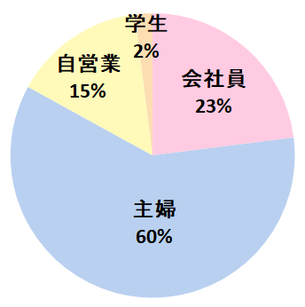 職業は主婦が60%と最も多く、次いで会社員23%、自営業15%、学生2%。家事や仕事の合間に体を整えたい方に支持されています。