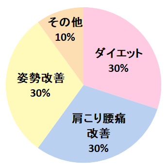 利用目的は、ダイエット30%・姿勢改善30%・肩こりや腰痛の改善30%と、健康と体のメンテナンスを目的に通う方が多い傾向です。